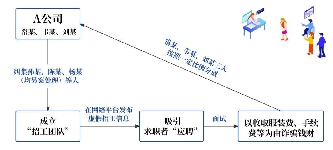 面试后,以“收取服装费、手续费等”为由诈骗钱财,由常某、韦某、刘某三人按照一定比例分成。至案发,常某诈骗金额约人民币2万元,韦某诈骗金额约人民币1.7万元。