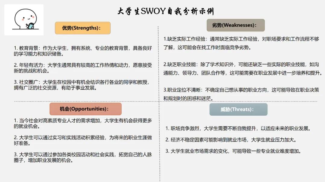 面对就业中的问题,我们首先要正确认识和评价自我,明确自己今后的职业发展方向,从职业发展的角度分析最适合自己的岗位特征和地域范围。比如,通过SWOT方法和“5W提问”来客观认识自己。