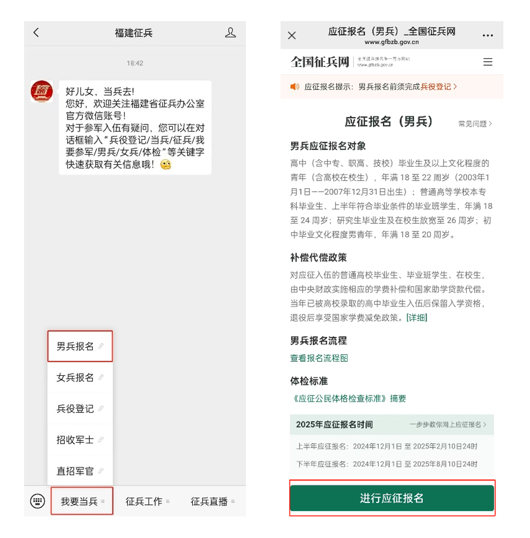 关注“福建征兵”,通过子菜单栏目“我要当兵”→“男兵报名”进行应征报名。