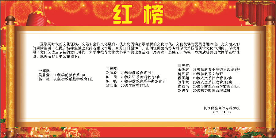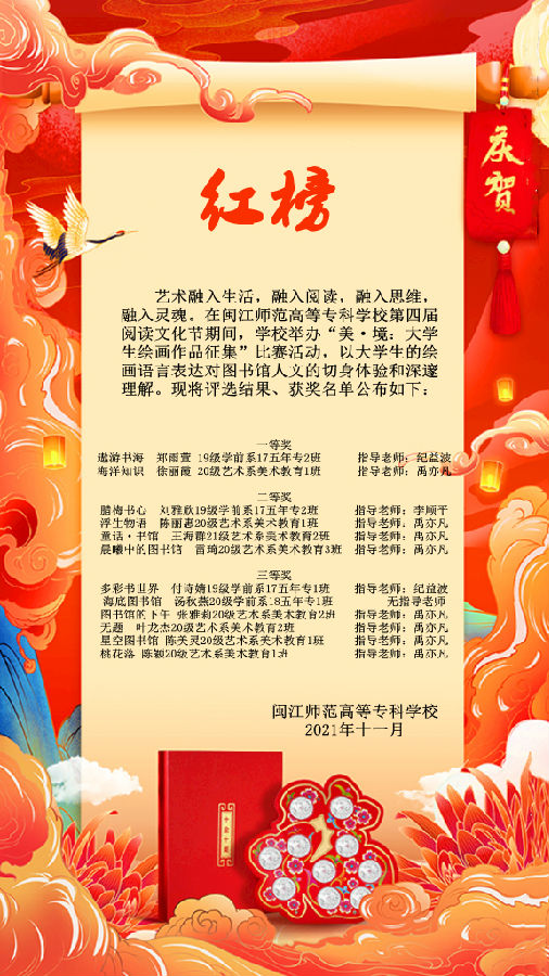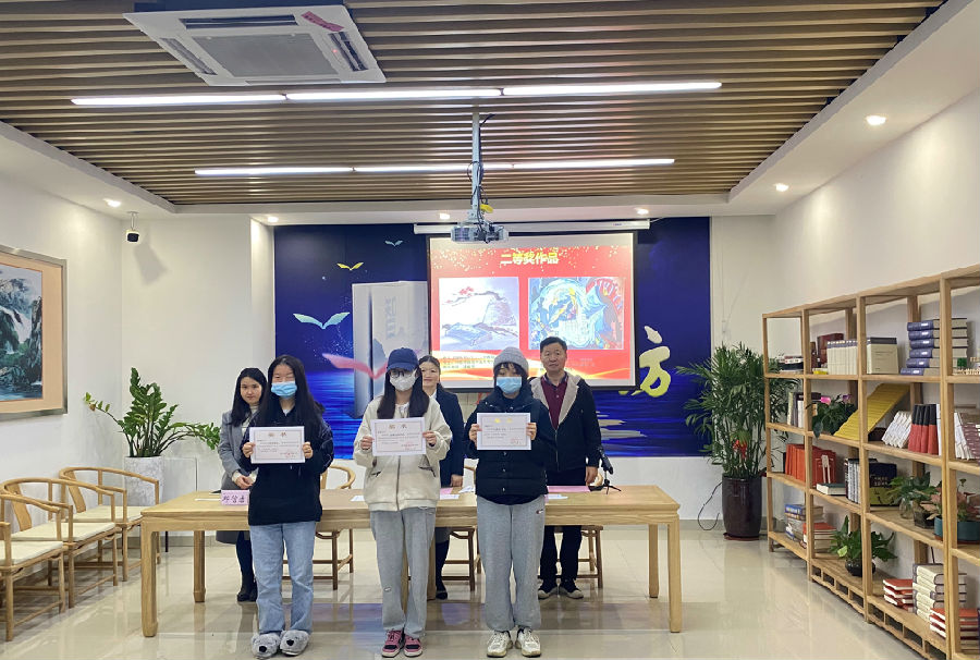 颁奖仪式首先由邱信洁副馆长宣读“文化阅读启示新的文化时代:大学生推荐文化类书单比赛”、“美·境:大学生绘画作品征集比赛”评选结果。接着,由领导们为获奖的24位学生颁发了奖状和奖品。20级学前教育系吴霖莹同学和20级艺术系徐丽霞同学代表获奖学生发言。两位同学表示,优秀文化值得我们学习和发扬,时代催促我们努力学习、不断进步。冰心先生说“读书好多读书 读好书”,通过推荐文化类书单比赛和绘画比赛让我们的文化视野宽广,精神生活品质得以提升,加深对人文艺术的思考。