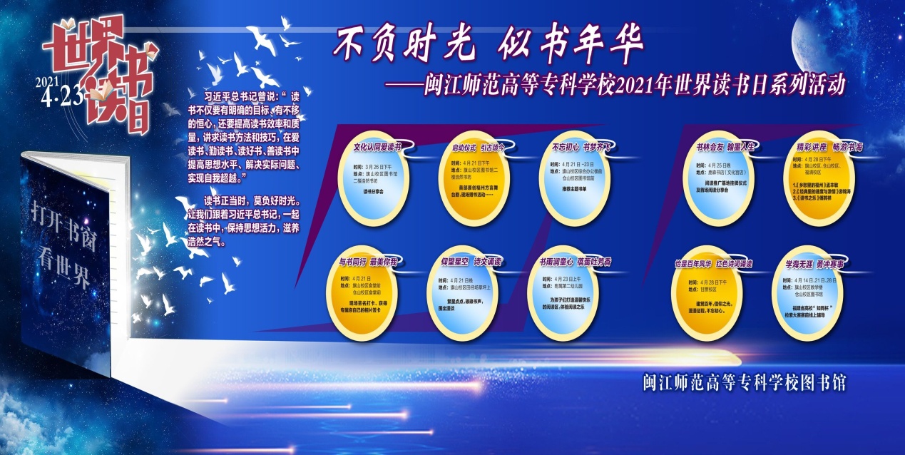 4月21日,“不负时光,似书年华”闽江师范高等专科学校世界读书日活动即将在旗山校区图书馆浩然书坊正式启动。春光正明媚,读书正当时,世界读书日一系列精彩活动,等着爱读书的你!