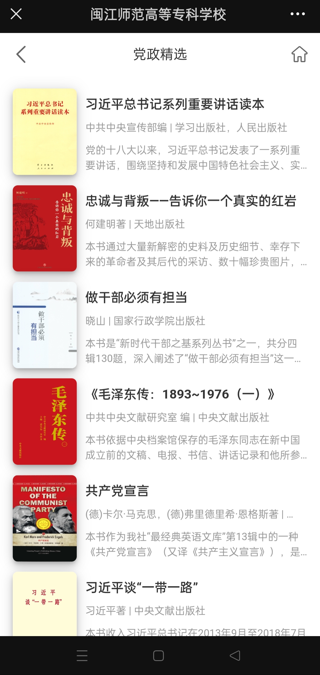 在图书馆微信公众号书香闽师专平台上开通党政精选专栏,利用数字阅读新媒体服务吸引广大读者积极学习党的二十大精神,仔细聆听党的二十大声音。同时,为满足老师们居家办公查阅文献的需求,开通了百度文库高校版校外访问服务平台和万方知识服务平台试用平台,带领老师以听、说、读、写的切身体验,深学党的二十大精神,增强爱国爱党精神。