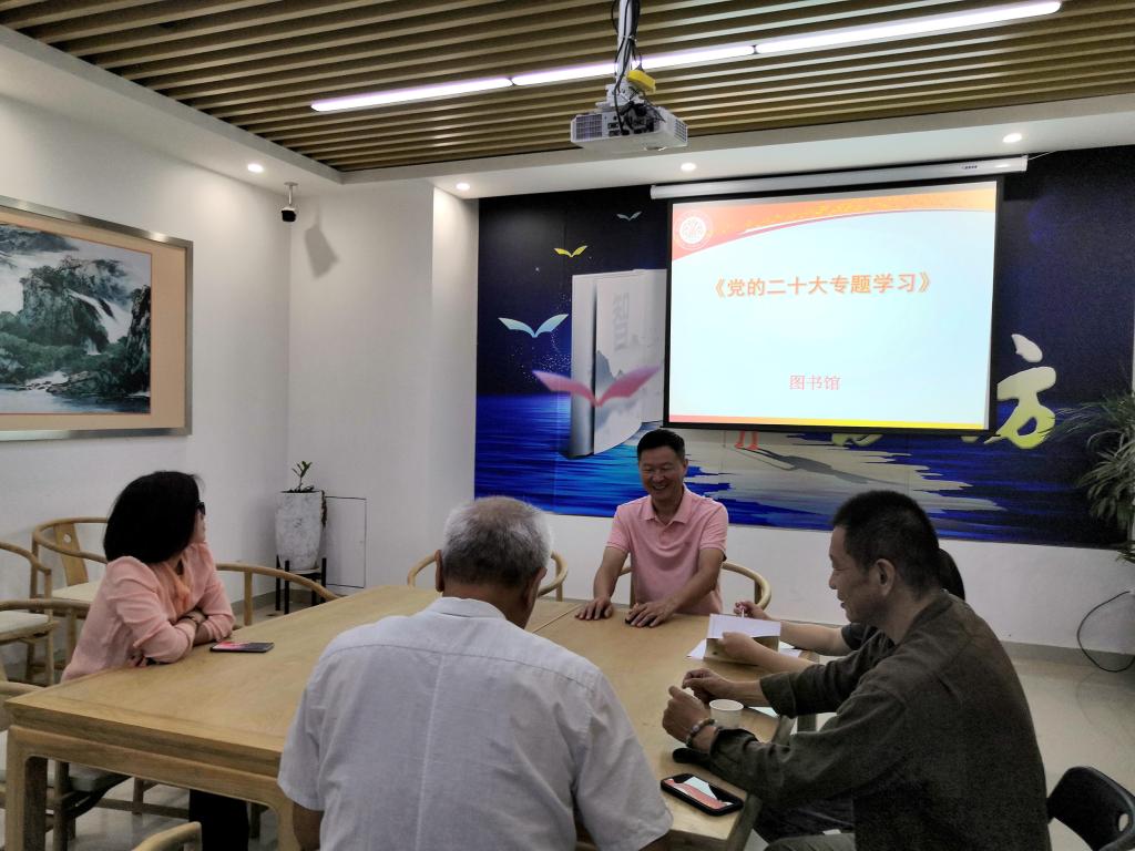 党的二十大召开以来,图书馆党支部积极发挥基层党组织堡垒作用,多措并举深入学习贯彻党的二十大精神,通过组织全体党员开专题会、党支部书记交叉上党课、党员分享学习心得、自由讨论等方式,深刻领悟党的二十大精神内涵,汲取奋进新征程的精神力量。