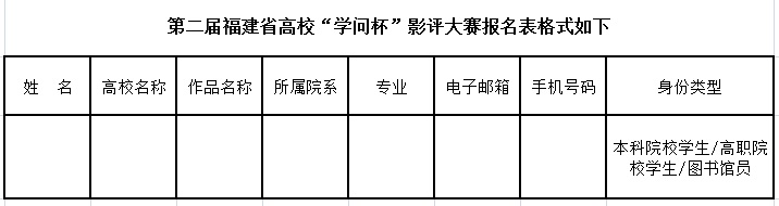 1.参赛者可从校图书馆网站或闽师专影评大赛活动QQ群文件中自行下载参赛报名表(附件)并填写,并将电子版作品及报名表一起发送至校图书馆自设的投稿邮箱;影评大赛不接收纸质版作品,所有参赛作品将以投稿邮箱为准。