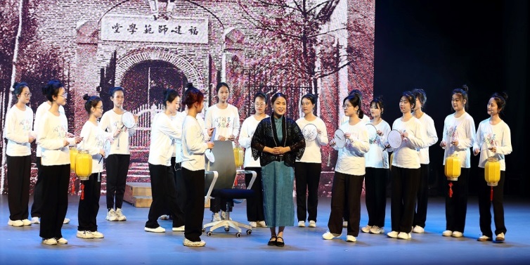 我馆精心打造的创新传承福州市非遗文化“闽都扛斋习俗”的朗诵剧《和冰心校友共扛斋》在文艺演出活动中首演。该剧编写了校友冰心受邀回母校与在校师生共同庆祝扛斋习俗文化活动的故事。剧中同学们以福州方言吟诵中华诗词名篇和冰心作品名篇,表达冰心先生浓浓的家国情怀,体现闽都优秀传统文化的传承魅力。该剧邀请福州方言与地方文史及民俗专家榕城担任编剧,国家二级导演张敏生担任导演。演员由闽江师范高等专科学校师生共同担纲。