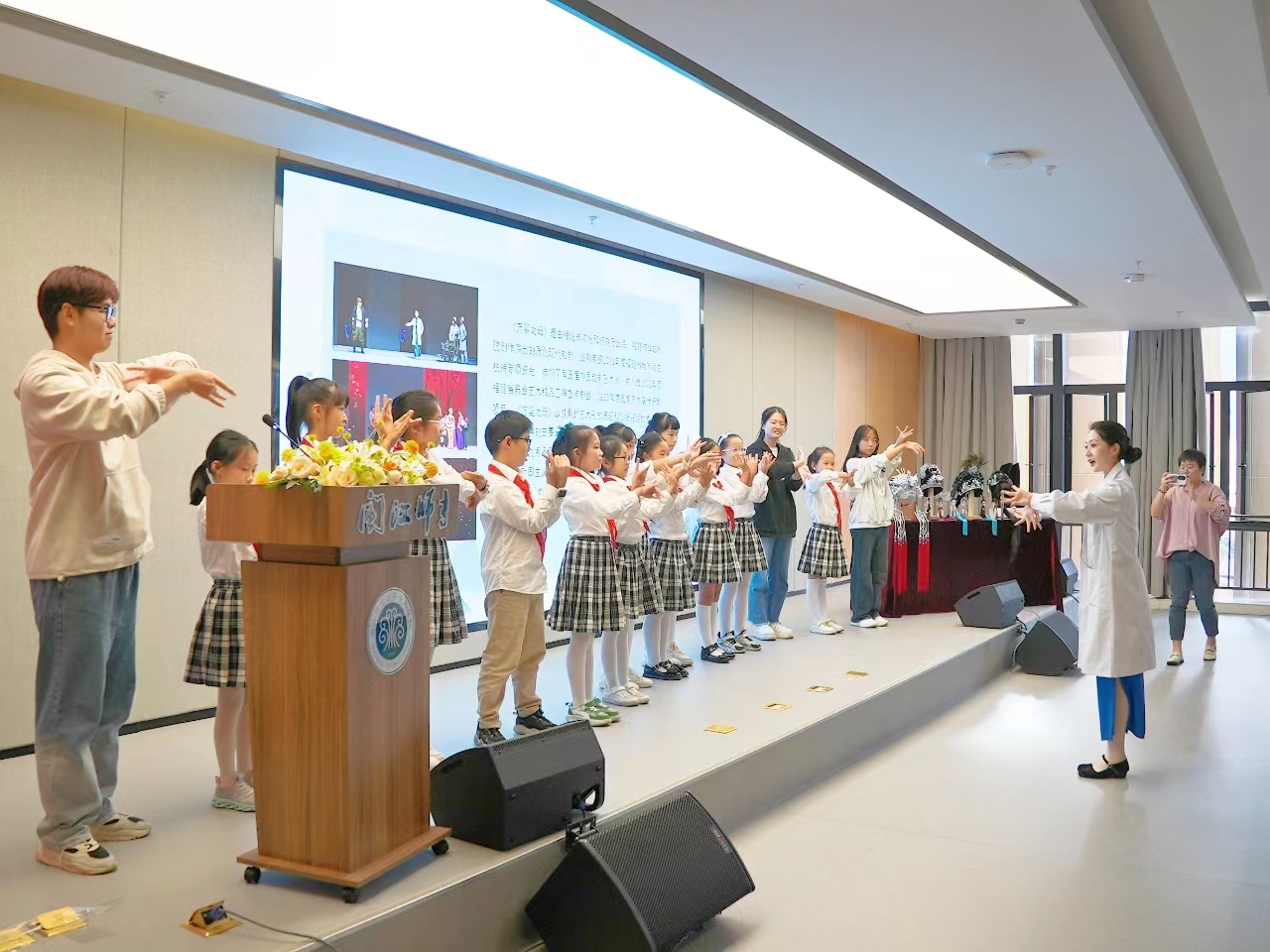 优秀青年演员们演唱示范《何文秀·心连心》《万婴之母·协和的窗前看祖国》等精彩选段,与现场师生亲密互动