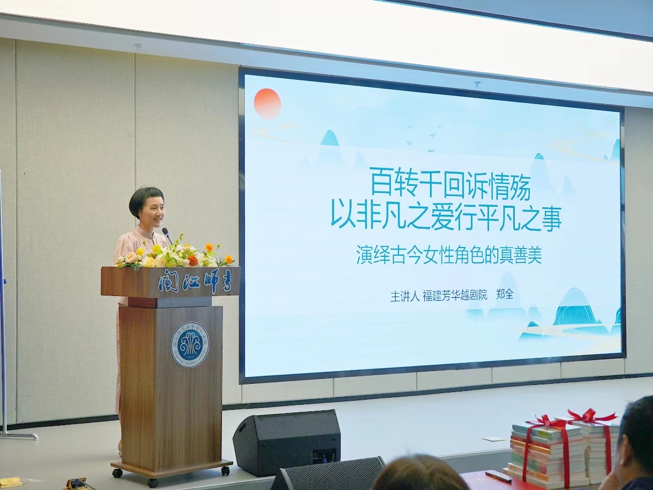 签约仪式后,福建芳华越剧院郑全书记为师生们带来了一场精彩的越剧名家讲座。讲座以《百转千回诉情殇|以非凡之爱行平凡之事——演绎古今女性角色的真、善、美》为主题,从多个角度深入剖析了越剧艺术中女性角色的塑造与表现。