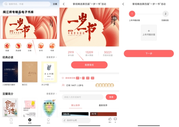 参与步骤:通过扫描二维码进入闽江师专精品电子书库进行注册--使用已注册的手机号登录掌阅精选APP--点击“我的”--制定个人阅读计划--完成阅读。
