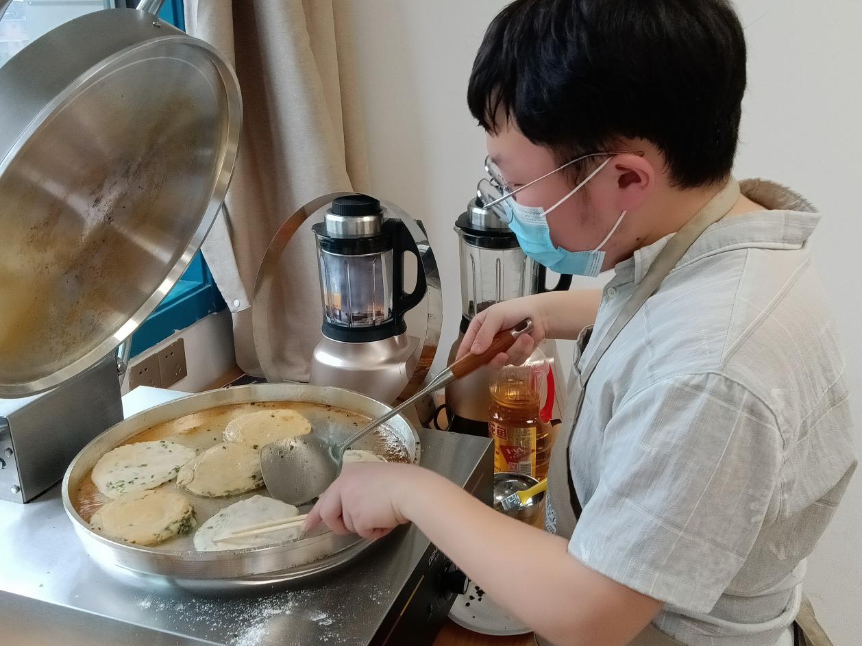 附小的孩子们离开知识的海洋,第一次走入厨房亲手烙饼,每个人的脸上都洋溢着快乐的笑容。他们认真地学习怎么制作葱油饼,在志愿者的帮助和指导下学会和面、擀面和煎饼。孩子们在不断尝试中逐渐熟练,面团也在他们的手中慢慢成型。