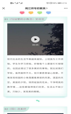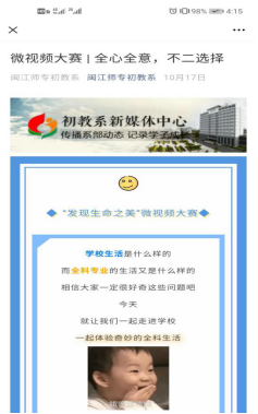 过程中,众多参赛选手的视频内容各具特色,有以夏冬交替为灵感创作的校园一角之生命律动,有以专业特色日常学习为内容,讲述个人和集体成长过程的酸甜苦辣,有以校园宏观视角下创作的闽师印象美学等等。每一部作品都为大家诠释了校园里生命之美,饱含了当代大学生对生命之美的理解和感悟。在初教学子热情的参与下,把此次微视频大赛推向高潮。历经大众线上投票评选和老师们公平公正公开的审核,最终有6件优秀作品脱颖而出。