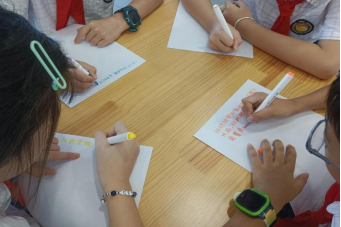 紧接着小老师为学生们分发了笔与A4纸,并出示四幅图片,通过选择其中任意一张图片,想象并描述其中的故事。在学生奋笔疾书的同时,小老师也积极互动,关注着每一位学生,为无头绪的学生提供思路,对学生碰到的疑难字词进行解答。随后学生举手发言,分享自己所写的作品以及里面蕴含的想法。语出世界,心相印,语相通,和谐共处乐融融。