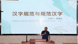 欧键汶主任以“汉字规范与规范汉字”为主题,从汉字规范小史、规范汉字四定、书写教学观念、科技协同创新等四个方面展开介绍。并运用丰富的例子揭开规范汉字的奥秘,为老师们进行规范汉字教学提供了专业指导。