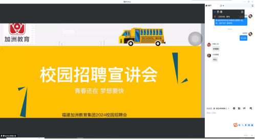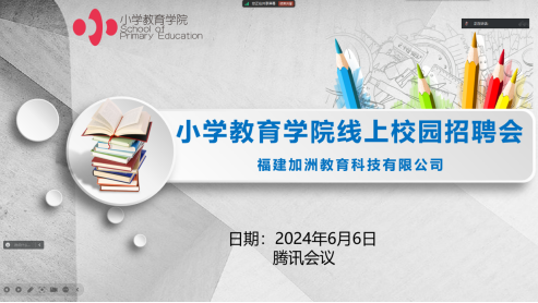 搭建用人单位桥梁,共筑职场蓝图。为进一步拓宽就业创业渠道,推动2024届毕业生就业服务工作,2024年6月6日下午,小学教育学院举办福建加洲教育科技有限公司线上校园招聘宣讲会,2024届毕业生近20余位学生参与,会议由辅导员林丽芳老师主持。