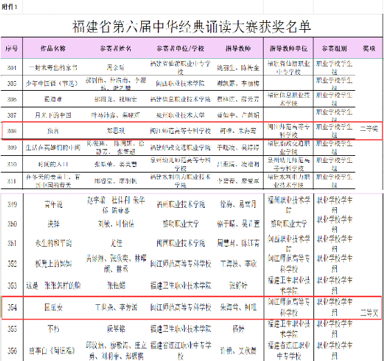 近日,福建省教育厅体育卫生艺术教育与语言文字处公布了“福建省第六届中华经典诵读大赛”的获奖结果。我院在此次大赛中成绩斐然,郑思琪同学的个人朗诵作品《预言》成功进入现场赛并荣获职业学校学生组二等奖;王世尧、李芳源两位同学的合作朗诵作品《回延安》,也以出色的表现获得职业学校学生组三等奖。