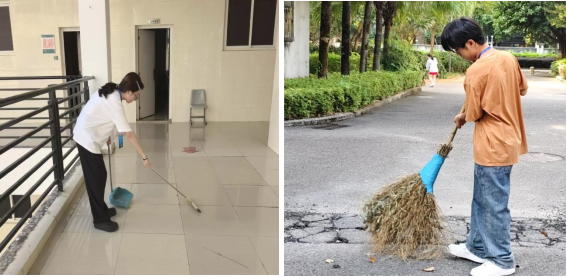 “学高为师,身正为范”,劳动是修身立身的生动课堂。劳动周期间,学生暂时放下书本与手机,走出教室、走进校园角落,全身心投入清扫工作:从操场的绿茵草地,到教学楼的楼道走廊,再到校园的边角区域,都有学生忙碌的身影——有人专注清扫落叶,让操场重归整洁;有人认真擦拭地面,让校园道路焕然一新;有人蹲身捡拾杂物,为校园“梳妆”……在炎炎夏日里,汗水与笑声交织,劳动的身影成为校园中最鲜活的风景。