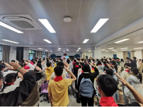 首先进行的是少先队员们对师范生的授巾仪式,戴上红领巾的师范生们身上承担着的不仅仅是教书的责任,更意味着如何育人。接着,和少先队员们一起举行升旗仪式,国歌响起,师范生们和少先队员一起行少先队礼,个个挺拔身姿,展现着他们无比奋发向上的精神面貌。