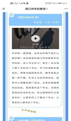 过程中,众多参赛选手的视频内容各具特色,有以夏冬交替为灵感创作的校园一角之生命律动,有以专业特色日常学习为内容,讲述个人和集体成长过程的酸甜苦辣,有以校园宏观视角下创作的闽师印象美学等等。每一部作品都为大家诠释了校园里生命之美,饱含了当代大学生对生命之美的理解和感悟。在初教学子热情的参与下,把此次微视频大赛推向高潮。历经大众线上投票评选和老师们公平公正公开的审核,最终有6件优秀作品脱颖而出。