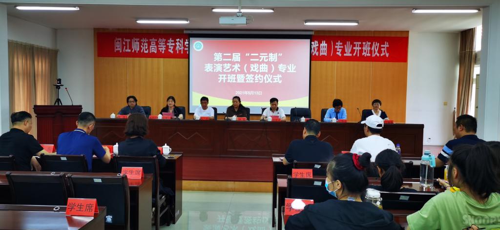 5月13日上午,我校在甘蔗校区举行第二届“二元制”表演艺术(戏曲)大专班开班暨签约仪式。福建省剧协主席、福建省文化和旅游厅艺术处处长吴新斌,福建省艺术研究院副院长白勇华,戏曲梅花奖获得者、福建省闽剧艺术研究会会长陈乃春,国家一级导演李幼斌,福建省京剧院院长孙劲梅,福建省实验闽剧院副院长林大立,福州市闽剧艺术传承发展中心主任杨东,闽侯县闽剧艺术传承发展中心书记潘振棋,以及我校党委书记陈荣生、副校长林旻、教务处处长葛思华、艺术系党政领导和“二元制”表演艺术(戏曲)专业全体师生出席。会议由校教务处处长葛思华主持。