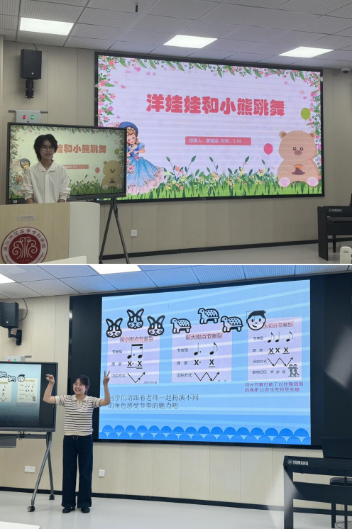 参赛学生围绕小学音乐教材设计教学内容,聚焦音乐核心素养,充分展现专业素养:有的用奥尔夫乐器创编节奏;有的通过游戏法有趣地导入学习内容;还有的化身“森林导游”,用身体律动演绎旋律特点。