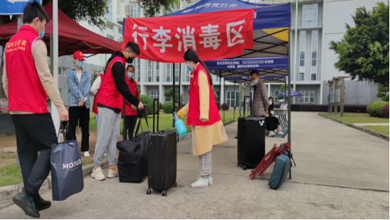 虽逢周末,但志愿者们自觉放弃了休假时间,早早地赶到学校。他们引导学生有序报到,积极地为返校学生进行行李消毒,帮助学生将沉重的行李提到宿舍。一天的志愿者服务,让大家都深感疲惫,但没有一个人有怨言,大家脸上都洋溢着善意的微笑,因为我们的服务为学生带来了方便,也为福州市艺术学校增添了一份温暖的色彩。