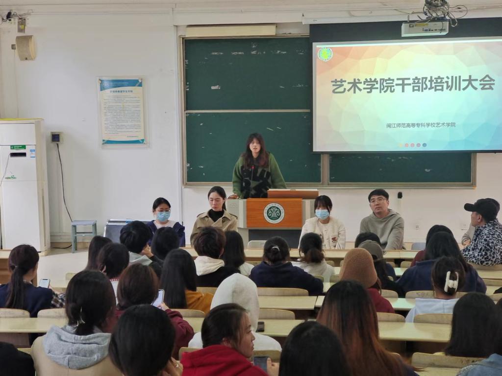 为提高学院学生干部工作能力,增强责任感与使命感,组建一支工作高效、团队协作、树立典范的学生干部队伍,11月16日下午,艺术学院召开两委学生会干部培训大会。本次培训对象为艺术学院两委学生会各部门负责人、各班级班长、团支书等学生骨干。会议由艺术学院团委书记周宇航主持,艺术学院副院长陈洪翔,艺术学院辅导员沈锦城老师、林惠楠老师、张琦榕老师、邓悦老师出席此次会议。