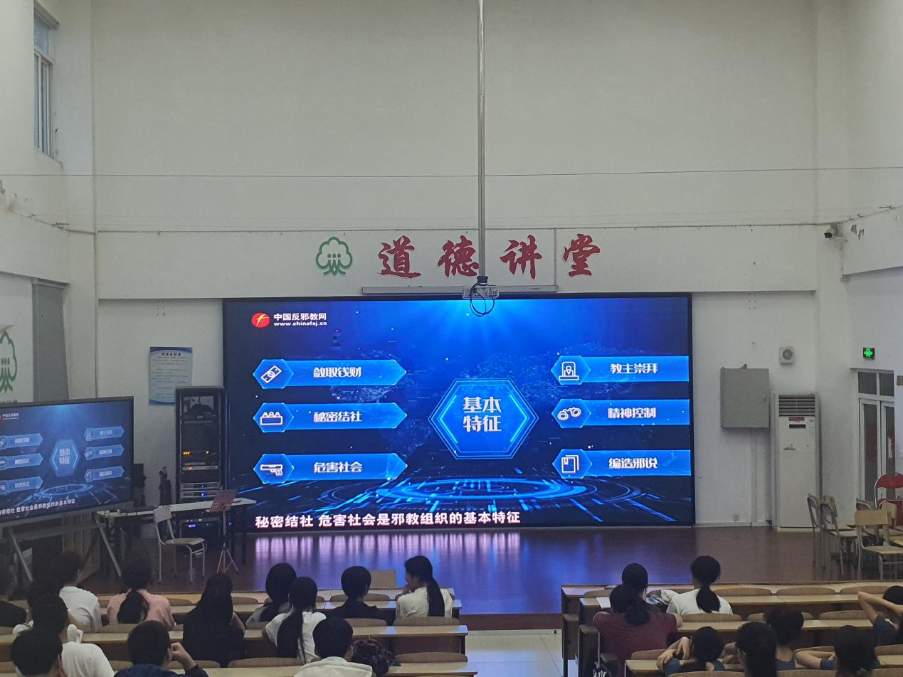 为了进一步推动反邪教警示教育工作的深入开展,切实加强学校学生防邪、拒邪、反邪的意识和能力,创造安全稳定的校园环境,2024年4月29日,我校组织学生在阶梯教室集中观看“反对邪教”警示教育片。