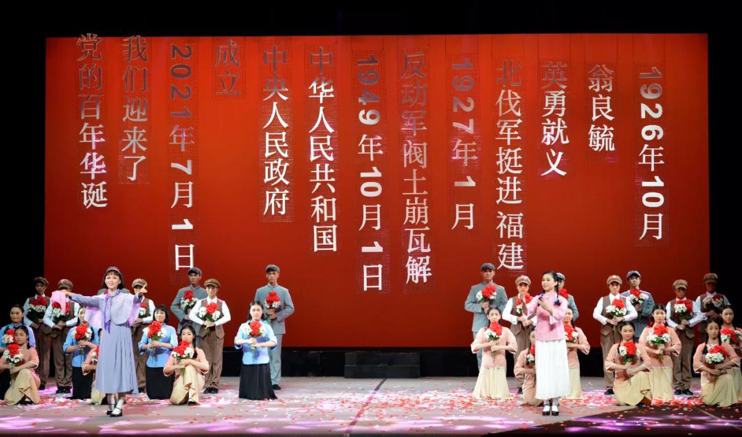 2021年学院倾心打造献礼建党100周年两部年度大戏:情景歌舞剧《奔腾向海》和闽剧现代戏《青春祭》。情景歌舞剧《奔腾向海》作为第八届福建艺术节暨第五届全省音乐舞蹈杂技曲艺优秀剧(节)目展演入选剧目在福州大学城文化艺术中心震撼亮相。200多名师生以歌以舞演绎着这座有着2200多年建成史的国家历史文化名城——福州的故事。2023年情景歌舞剧《奔腾向海》又在福建大剧院和闽江之心隆重开演,至今已完成60余场,演出吸引了50余万名观众观看,点赞数超过了46万。