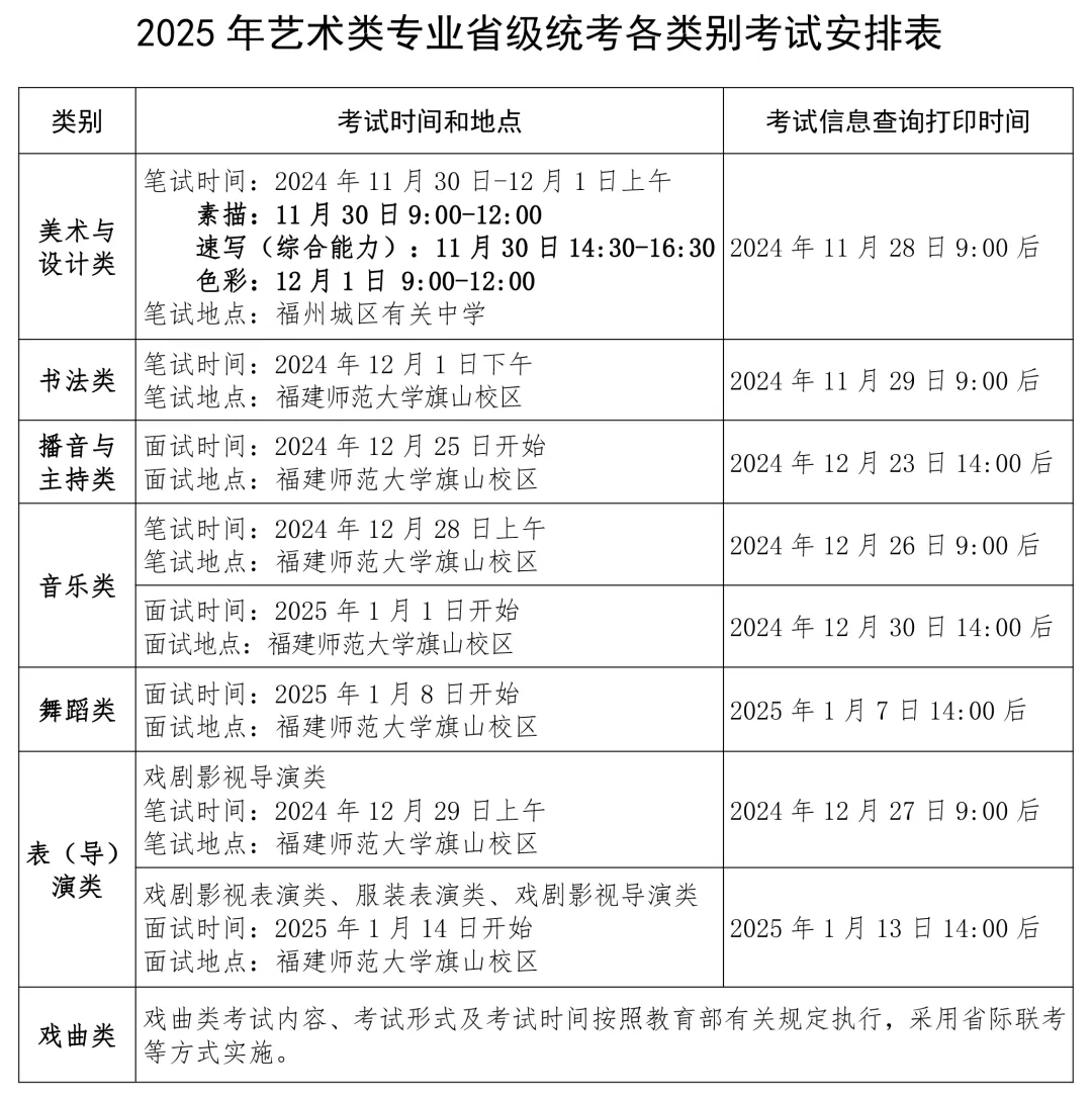 日前,福建省教育厅印发《关于做好2025年普通高校招生艺术类专业省级统一考试工作的通知》,2025年艺术类省级统考定于2024年11月至2025年1月进行,各类别考试时间具体如下: