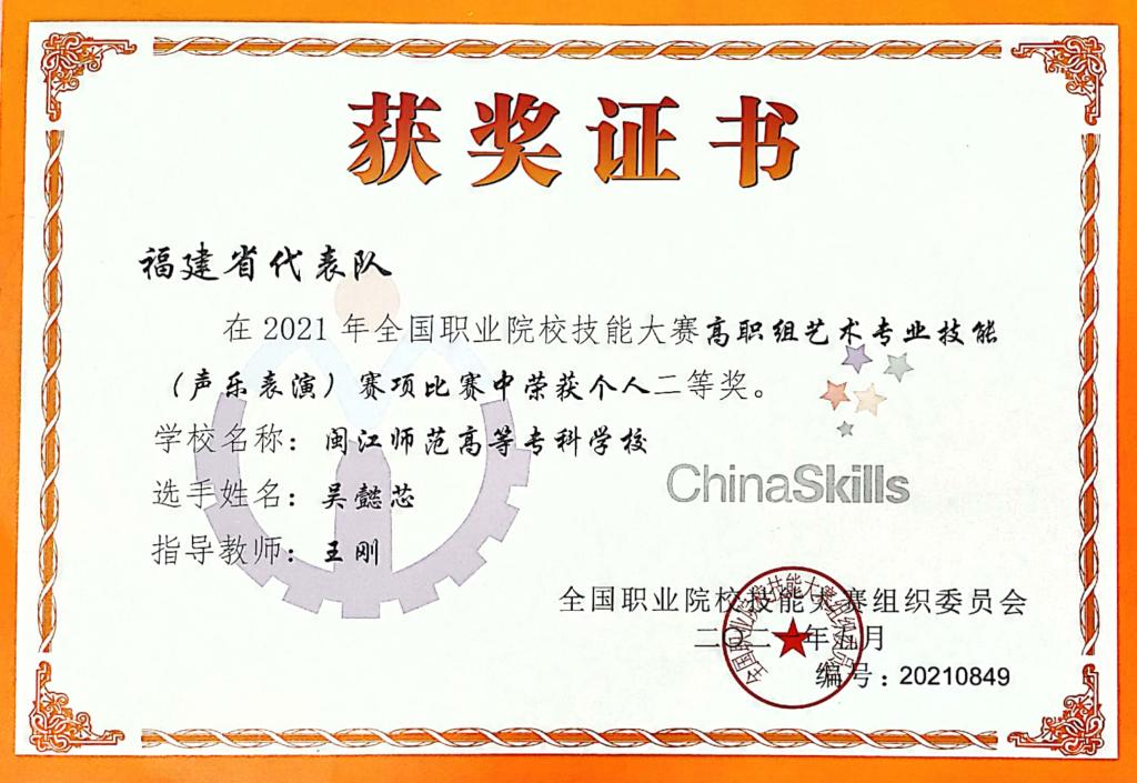 近日,全国职业院校技能大赛高职组艺术专业技能(声乐表演)赛项在浙江艺术职业学院隆重举行,来自全国各省及直辖市29个代表队参加。我校作为福建省唯一代表队,经过两轮比赛的激烈角逐,最终我系参赛选手吴懿芯(16级音乐教育五年专)以优异的成绩荣获个人赛二等奖。