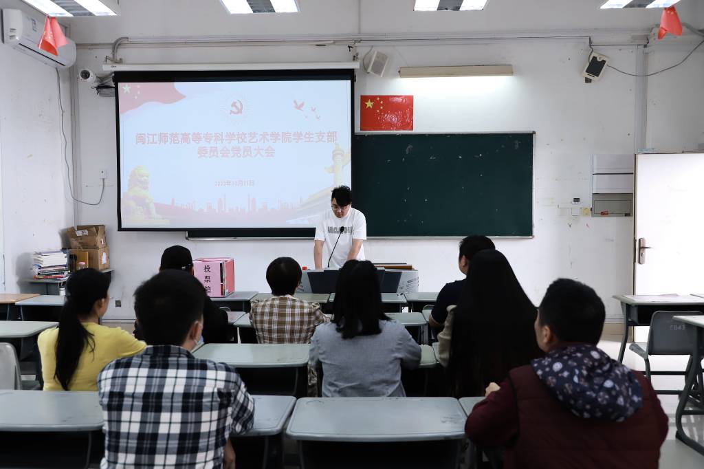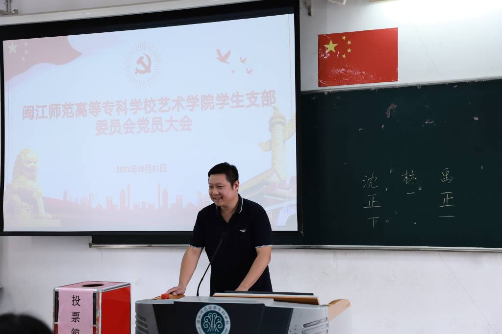大会在庄严的国歌中拉开帷幕。会上,全体党员采取无记名投票和差额选举办法,选举产生沈锦城、禹亦凡2位同志为中共闽江师范高等专科学校艺术学院学生支部委员会委员。紧接着学生支部委员会召开第一次全体会议,选举沈锦城同志为组织委员兼纪检委员,禹亦凡同志为宣传委员,并明确了各委员工作职责。