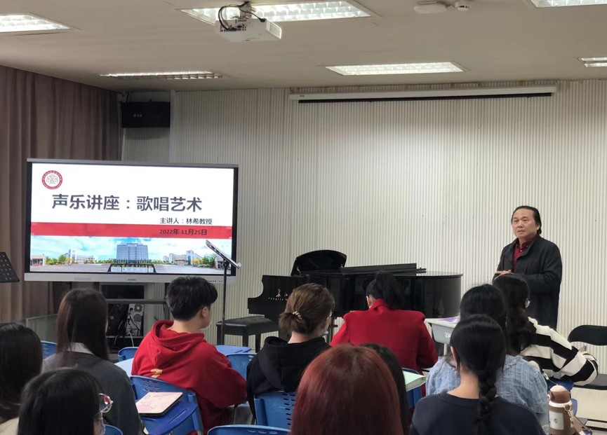 2022年11月25日下午,我校艺术学院邀请全国高师声乐学术委员会委员、原福建师范大学音乐学院声乐系主任——林希教授莅临我院开设《歌唱艺术》专题讲座。本次讲座由方晶副院长主持,声乐教研室全体教师及全体声乐专业主修学生参加。
