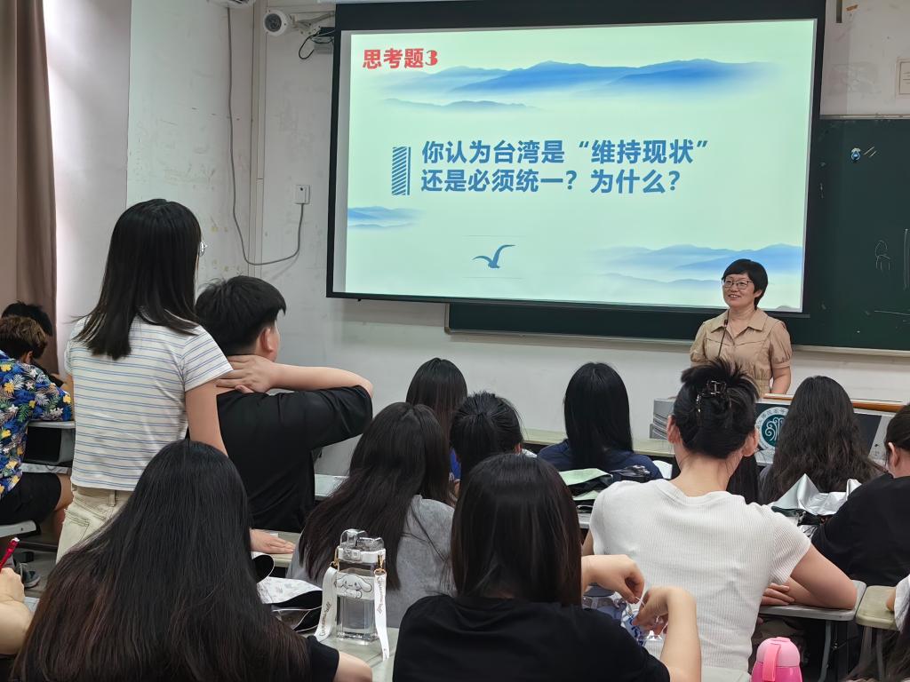 “台海局势面临紧张,你认为主要根源在哪里?”“你认为台湾问题与乌克兰问题有可比性吗?”“你认为台湾是“维持现状”还是必须统一?为什么?”6月7日,艺术学院党委书记江柳青走进思政课堂,以《在新时代新征程上推进祖国统一》为题,为2021级音乐教育1班的同学们上了一堂精彩纷呈的形势与政策课。