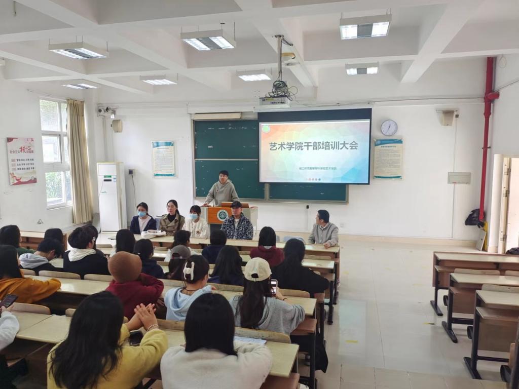 为提高学院学生干部工作能力,增强责任感与使命感,组建一支工作高效、团队协作、树立典范的学生干部队伍,11月16日下午,艺术学院召开两委学生会干部培训大会。本次培训对象为艺术学院两委学生会各部门负责人、各班级班长、团支书等学生骨干。会议由艺术学院团委书记周宇航主持,艺术学院副院长陈洪翔,艺术学院辅导员沈锦城老师、林惠楠老师、张琦榕老师、邓悦老师出席此次会议。