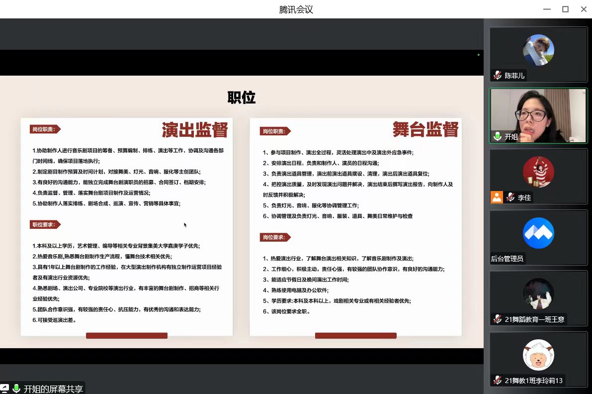 本次线上招聘会以“岁寒情暖,职引未来”为主题,采用企业线上宣讲+在线投递简历+视频面试的方式,旨在进一步深化校企合作,促进毕业生高质量就业。舞蹈教研室主任李佳率全体教研室老师参与并进行线上指导,舞教专业毕业生全员参与。