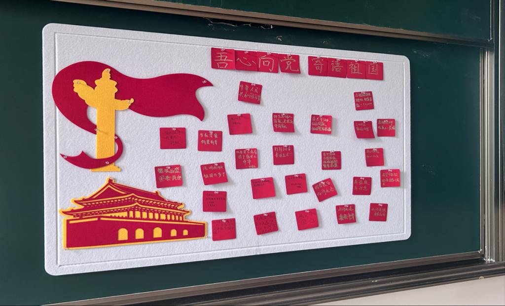 活动现场,一面精心设计的留言墙格外吸睛——天安门城楼图案庄重典雅,“吾心向党,寄语祖国”八个大字醒目耀眼。活动伊始,部门副部长发表热忱致辞,细数76年来新中国在中国共产党的领导下创下的举世成就,并号召同学们写下对祖国的赤诚之心与祝福。