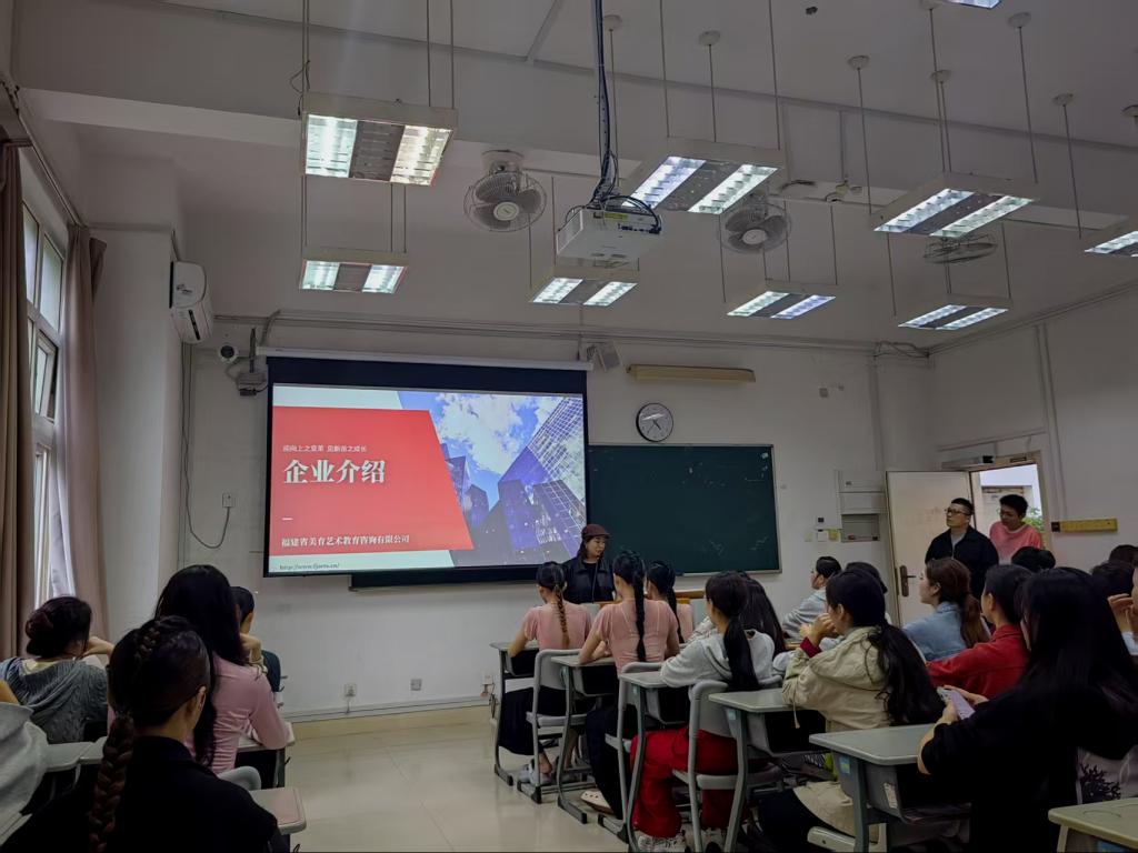 宣讲会伊始,福建省街舞协会首先详细介绍了企业发展情况。福建省街舞协会于2016年11月17日登记成立,是由舞蹈艺术家及工作者组成的专业性社会团体,多年来,协会积极开展创作培训、赛事展演、文艺惠民等活动,为推动福建舞蹈事业发展和两岸文化交流作出了积极贡献。随后,福州六艺通信息咨询有限公司负责人介绍了企业情况,并欢迎毕业生积极投身艺术实践、艺术研学及艺术专项课程体系建设。福建省美育教育咨询有限公司负责人则介绍了公司的业务范围及对招聘人才的具体要求。