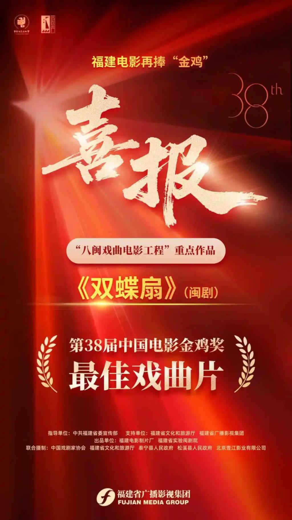 由中共福建省委宣传部指导,福建省文化和旅游厅与中国戏剧家协会、福建省广播影视集团联合摄制,福建省实验闽剧院与福建电影制片厂有限公司共同出品,我校艺术学院副院长、一级演员、中国戏剧“梅花奖”得主陈洪翔,中国戏剧“梅花奖”获得者、一级演员周虹及江忠岩领衔主演的闽剧电影《双蝶扇》,在第38届中国电影金鸡奖中喜获“最佳戏曲片”大奖,实现福建戏曲电影金鸡奖零的突破!