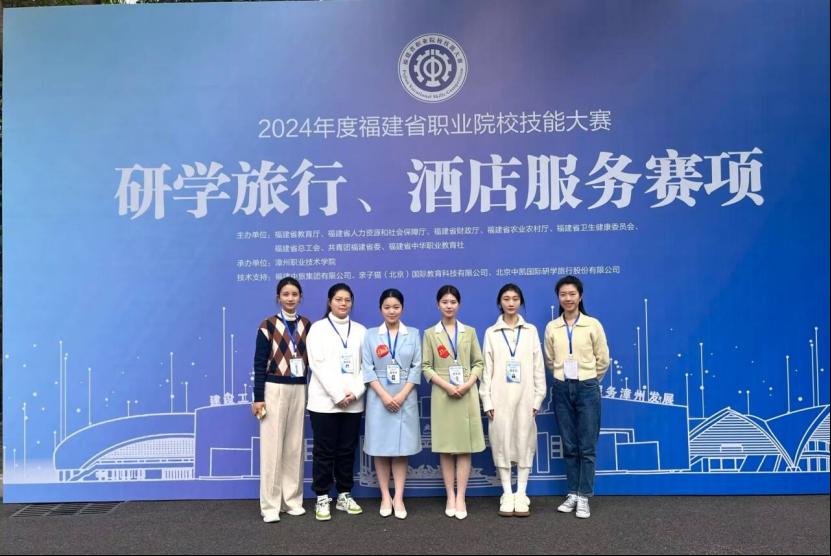 近日,由福建省教育厅、福建省人力资源和社会保障厅、福建省财政厅等八部门主办,2024年福建省职业院校技能大赛高职组研学旅行赛项在漳州职业技术学院举办,全省21所高职院校派队参赛。我校导游专业21导游1班陈晶晶、林佳雪,20导游五年专江文婷、翁怡玥4位同学组队参赛,在指导团队刘佳玲和邓婕两位教师的悉心指导下,荣获一等奖第二名的好成绩。