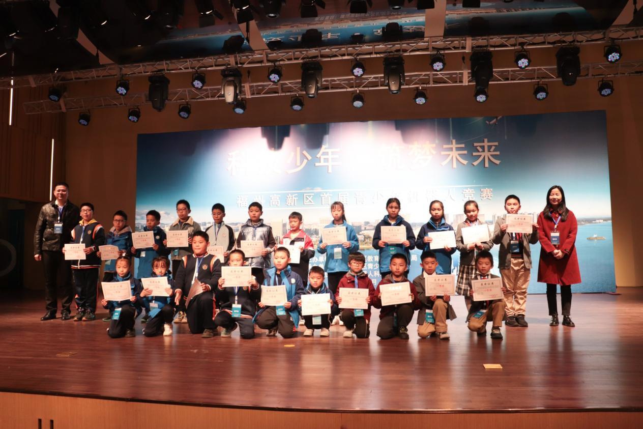 比赛现场,各竞赛项目精彩纷呈,选手们激情满满地参与到丰富多彩的机器人竞赛中。大家精神饱满,思考严谨,合作默契,参赛选手们在赛场上大显身手,有的神情专注地编写机器人程序,有的沉着冷静地调试和操作机器人,有的在彼此的交流中碰撞出更具新意的想法。经过一下午的精彩角逐,共评出一等奖13队,二等奖22队,三等奖39队。福州高新区教卫局、商务局、青少年活动中心领导及福州高新区相关小学校长共同为选手们颁发了奖状。
