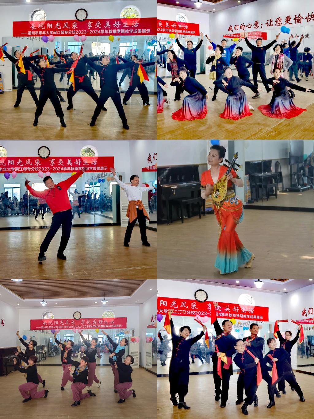 2023年12月18日至2024年1月2日,福州市老年大学闽江师专分校成功举办2023年秋季学期期末教学成果汇报活动。我校原党委书记陈荣生、老年大学校长黄耀荣、副校长林朝阳及教务处主任翁溯芬等莅临现场。各班级学员认真排练,精心策划准备,为观众呈现了一场又一场精彩纷呈的汇报表演。