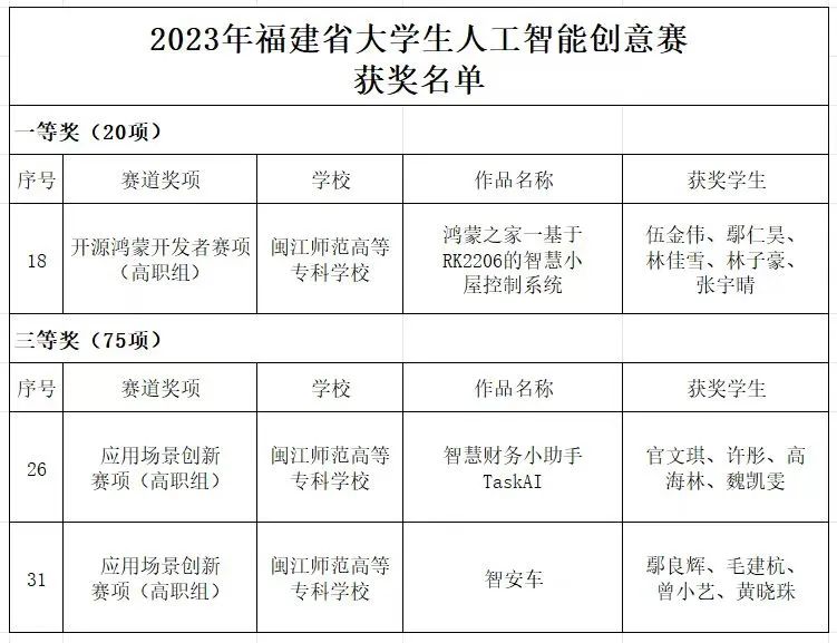 在2023年福建省大学生人工智能创意赛中,由朱发财、管定铕两位教师指导的作品《鸿蒙之家-基于RK2206的智慧小屋控制系统》获得开源鸿蒙开发者赛项(高职组)一等奖;由李彬雅、李翔宇两位教师指导的作品《智慧财务小助手TaskAI》和王凤姣、谢金池两位教师指导的作品《智安车》均获应用场景创新赛项(高职组)三等奖。