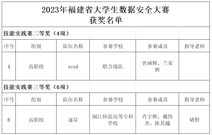在2023年福建省大学生数据安全大赛中,我校21级信息安全技术应用专业学生曾涵辉与其他高校学生组成的联合战队获得技能实践赛(高职组)二等奖,由我校教师褚野指导的逐星队获得技能实践赛(高职组)三等奖。