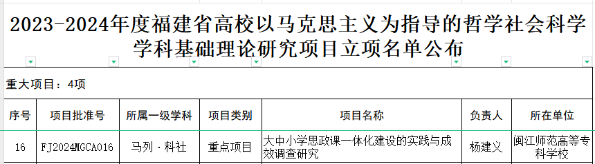 近日,福建省社会科学规划办公室公布了2023-2024年度福建省高校以马克思主义为指导的哲学社会科学学科基础理论研究项目立项名单,杨建义校长主持的课题《大中小学思政课一体化建设的实践与成效调查研究》成功列入重点项目之列。在本次福建省高校以马克思主义为指导的哲学社会科学学科基础理论研究项目中,共计立项59项,包括4项重大项目和55项重点项目。我校成为唯一一所获得该项目的高职高专类院校。