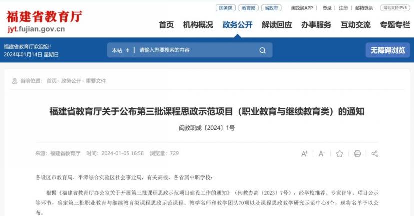 近日,福建省教育厅发布《福建省教育厅关于公布第三批课程思政示范项目(职业教育与继续教育类)的通知》(闽教职成〔2024〕1号),我校《心理测量》课程荣获省级课程思政示范项目。