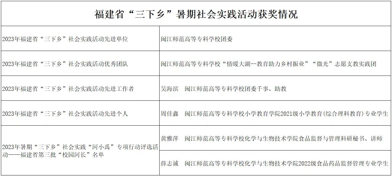 近日,共青团福建省委公布了“三下乡”暑期社会实践活动评审结果。学校团委获评2023年福建省“三下乡”社会实践活动先进单位;“情暖大湖——教育助力乡村振兴”“微光”志愿支教实践团获评2023年福建省“三下乡”社会实践活动优秀团队;校团委吴海滨老师获评2023年福建省“三下乡”社会实践活动先进工作者;小学教育学院学生周佳鑫获评2023年福建省“三下乡”社会实践活动先进个人。在2023年福建省暑期社会实践“河小禹”专项行动评选活动中,我校化学与生物技术学院教师黄雅萍、学生薛志诚入选福建省第三批“校园河长”名单。