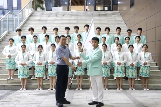 谢敏峰向志愿服务队授旗,同时向同学们提出三点要求:一是树立形象,在现场的服务中展现闽师学子风采;二是尽职尽责,不迟到早退,认真完成好岗位工作;三是树牢安全意识,把安全放在第一位,在服务期间用良好的精神面貌顺利完成服务。