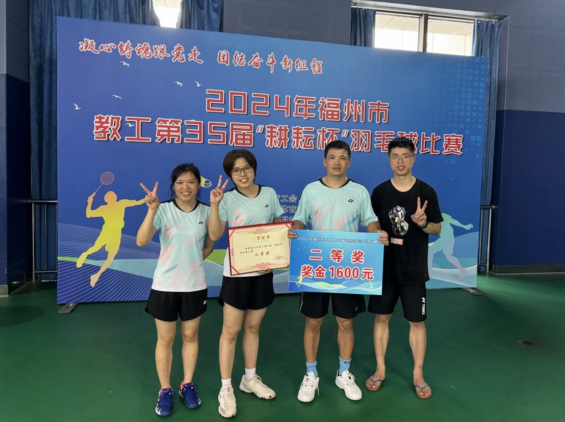 5月25日至5月26日,由市教育工会组织的第35届福州市教工“耕耘杯”羽毛球比赛在福州工人文化宫举行。我校教工羽毛球协会成员陈杰(男单)、林雅婷(女单)、李劲和陈清钰(混双)组成代表队参赛,在61支参赛队伍中,一路披荆斩棘,拼进决赛,最终获得二等奖的佳绩!
