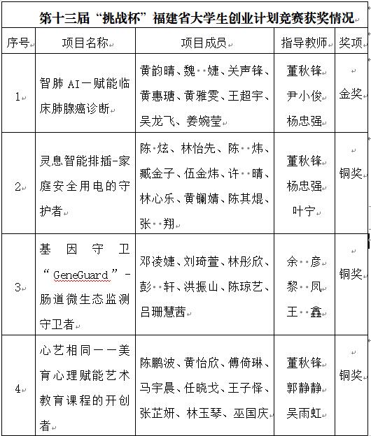 近日,第十三届“挑战杯”福建省大学生创业计划竞赛暨第十三届福建省大学生“创业之星”评选活动终审决赛在厦门大学嘉庚学院圆满落幕。经过激烈的角逐,我校《智肺AI—赋能临床肺腺癌诊断》项目荣获金奖,《灵息智能排插-家庭安全用电的守护者》《基因守卫“GeneGuard”-肠道微生态监测守卫者》《心艺相同——美育心理赋能艺术教育课程的开创者》三个项目均荣获铜奖。
