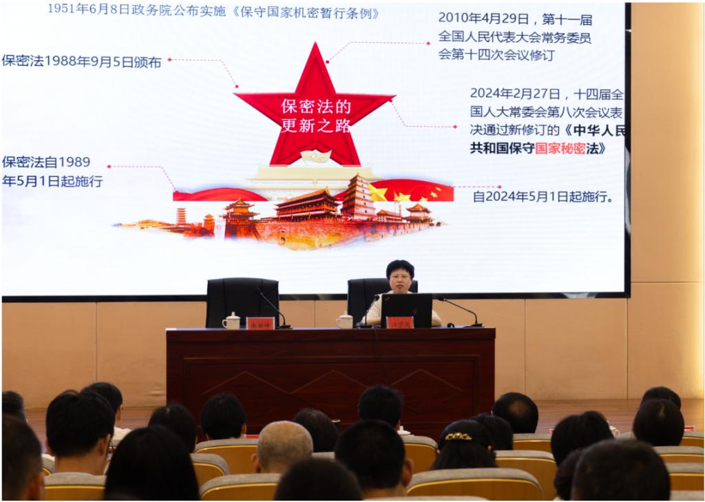汪学英以“聚焦新修订保密法的变化”为题,对新修订保密法的重大意义、新旧保密法重点变化对照、新修订保密法的重点内容等方面进行了全面系统的讲解,并结合实际工作中常见的泄密典型案例,对保密和国家安全的注意事项进行了深入浅出、全面详细地分析和讲解。