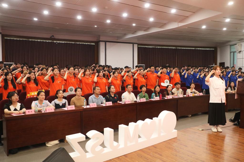 6月20日,我校2024年暑期“三下乡”社会实践动员大会暨出征仪式在仓山校区图书馆二楼学术报告厅举行。里约奥运会女子举重63公斤级冠军、省政协委员、省体育局团委书记邓薇受邀参加活动,校党委委员、副校长谢敏峰,学生处、团委、马克思主义学院相关人员,仓山校区二级学院分管学生工作负责人和各二级学院团委书记、暑期社会实践指导教师代表、第六期“青马工程”培训班学员代表、青年学生代表220余人共同参加活动。